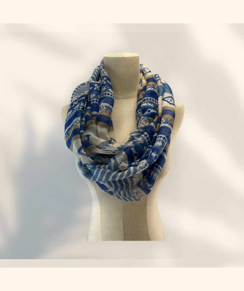 This ethnic bohemian-inspired infinity scarf is made of a 100% Polyester cotton-like gauze fabric, giving it a lightweight and breathable quality that is soft to the touch and non-irritating. Its dimensions measure 35" X 70" and it is designed to be doubled for a fuller look and feel. A great present for any occasion, it can be washed with cold water and ironed on a low heat setting.