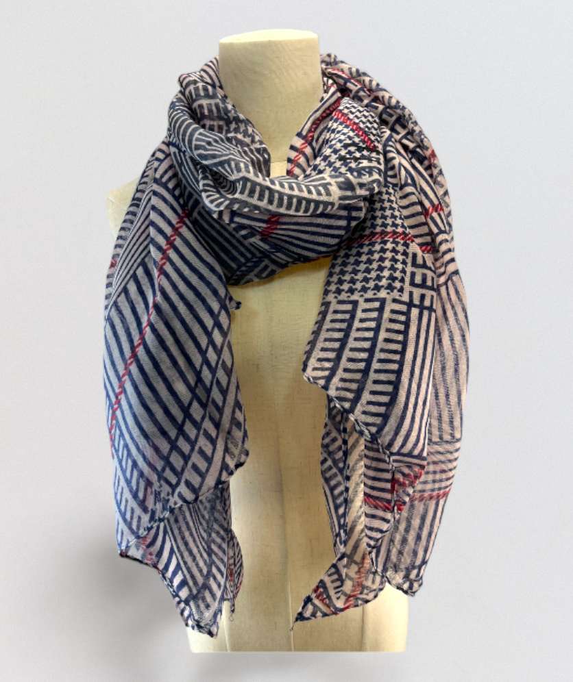 This elegant infinity scarf features a geometric print pattern is made of a 100% Polyester cotton-like gauze fabric, giving it a lightweight and breathable quality that is soft to the touch and non-irritating. Its dimensions measure 35" X 70" and it is designed to be doubled for a fuller look and feel. A great present for any occasion, it can be washed with cold water and ironed on a low heat setting.